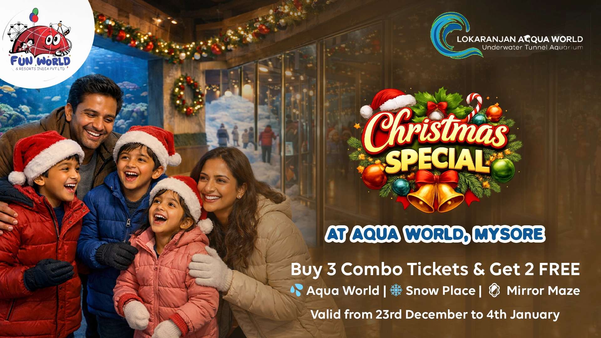 Celebrate Christmas with a special festive combo ticket offer that lets you enjoy the Aquarium, Snowplace, and Mirror Maze together at great value. 🎟️ Only Online Booking: https://underwaterzone.in/tickets/christmas-offer#booking